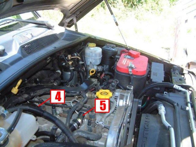 Battery back in place. I don't think one can tighten down the battery clamp after the hoses are in place. PCV valve [4] and already disconnected hose [5]. |
