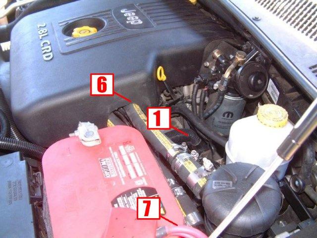 Opening cut in engine cover [6]. Bosch relay relocated [1]. Battery cable [7] snaked under ProVent. |